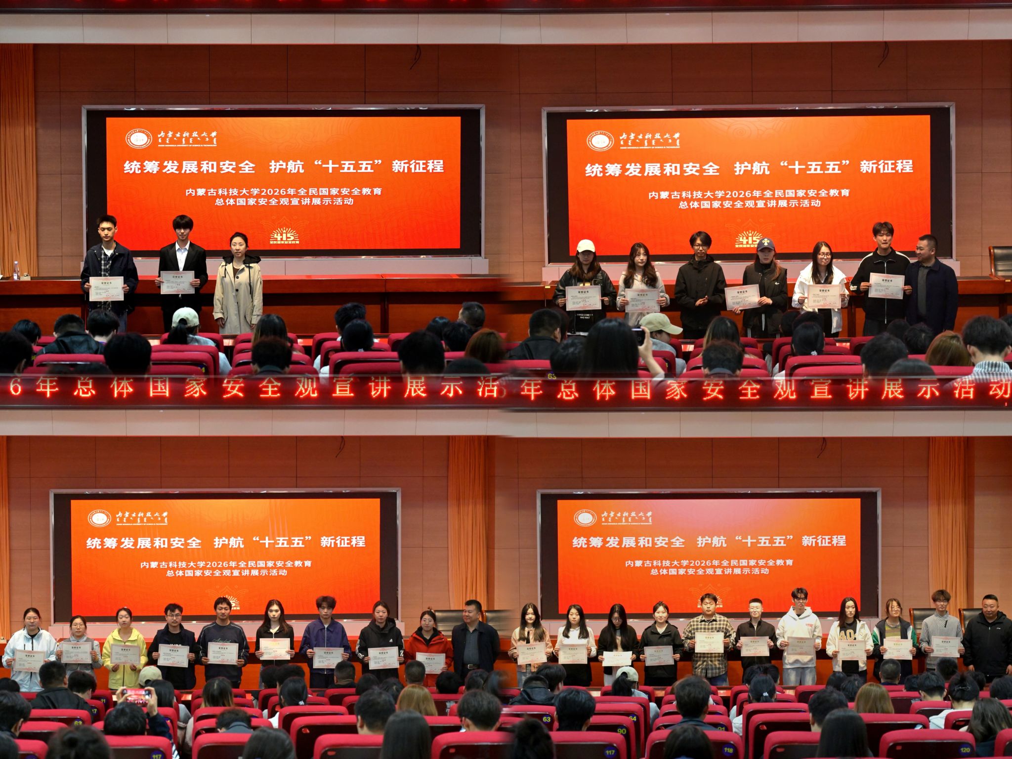 互动环节后,举行2026年内蒙古科技大学大学生践行总体国家安全观宣讲活动证书颁发仪式。与会嘉宾依次为获得一等奖、二等奖、三等奖及优秀奖的宣讲团队颁发证书,对各团队的精心准备、精彩展示给予充分肯定,鼓励大家持续发挥宣讲作用,带动更多师生关注国家安全、守护国家安全。